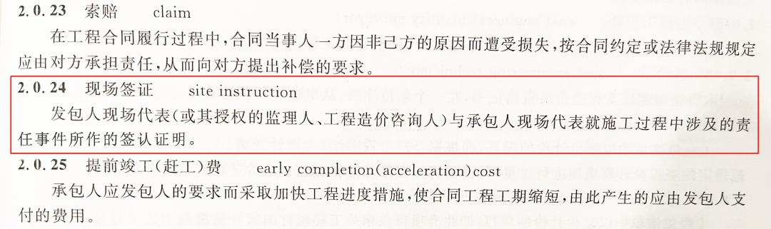 依據(jù)《建設(shè)工程工程量清單計(jì)價規(guī)范》(GB50500-2013)第2.0.24條對現(xiàn)場簽證的定義:“發(fā)包人現(xiàn)場代表與承包人現(xiàn)場代表就施工過程中涉及的責(zé)任事件所作的簽認(rèn)證明。”