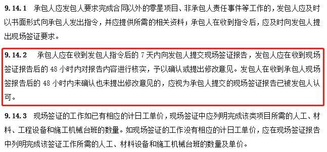 此外,第9.14.2條中,“......發(fā)包人在收到承包人現(xiàn)場簽報(bào)告后的48小時內(nèi)未確認(rèn)也未提出修改意見的,應(yīng)視為承包人提交的現(xiàn)場簽證報(bào)告已被發(fā)包人認(rèn)可。”即,從時限來講,“48小時”亦非能夠滿足發(fā)包方充分詢價并與承包方定價的時長。