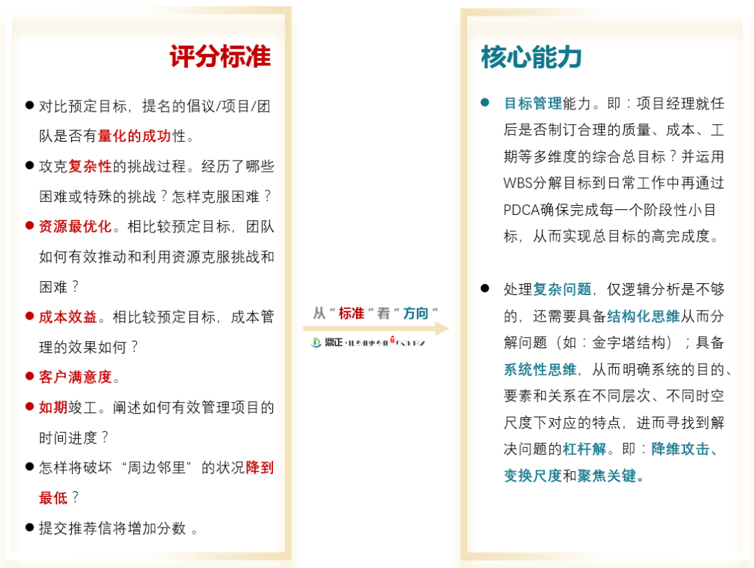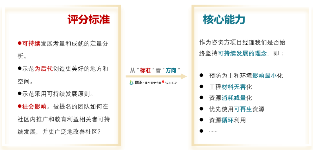 通過此次評獎申報過程中的思考與體會,我們想從RICS中國獎評分標準談談項目經理的努力方向。無論是投資決策咨詢、規劃設計,還是政府采購與招標代理、工程造價咨詢、工程監理及項目管理咨詢的項目經理,都需要明確?優秀的項目管理是什么樣的?要實現這些成果需要培養并精進哪些核心能力?