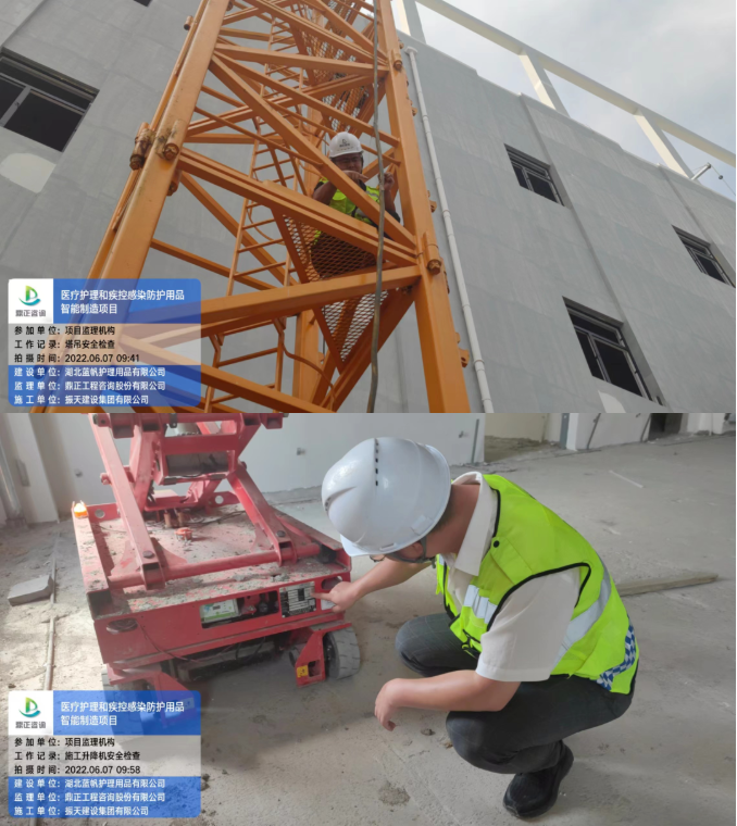 6月7日,醫(yī)療護(hù)理和疾控感染防護(hù)用品智能制造項(xiàng)目總監(jiān)理工程師陳雄對施工現(xiàn)場進(jìn)行塔吊、物料提升機(jī)、施工升降機(jī)、吊籃、臨時(shí)用電進(jìn)行聯(lián)合檢查,現(xiàn)場抽檢施工單位的安全生產(chǎn)規(guī)范。此次檢查以安全生產(chǎn)細(xì)化管理為要求,以查隱患、找短板、促整改、防事故為目的。安全是確保工程質(zhì)量的前提條件,質(zhì)量是建設(shè)單位所追求的最終目標(biāo),安全則是實(shí)現(xiàn)這一目標(biāo)的基本環(huán)境條件,安全監(jiān)理是這一環(huán)境條件的保護(hù)神。