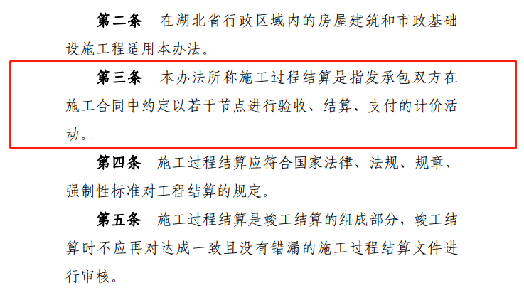 本條定義何為施工過程結算,相較住建部2021年發布的《建筑工程施工發包與承包計價管理辦法》(修訂征求意見稿)第十九條規定“全面推行施工過程結算和支付。發承包雙方通過合同約定,按時間節點或進度節點對周期內已完成且無爭議的工程量進行價款計算、確認,并按照合同約定比例支付。”《暫行辦法》增加了節點驗收,驗收是節點結算與支付的前提。