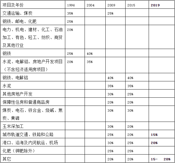 國發〔1996)35號規定了項目資本金占總投資最低比例,后續年份多次發文調整,具體整理如下: