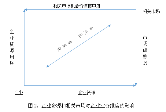 當前我國城建領域市場成熟度較低,市場價值集中度不高,比較適合進行多元化經營。另外,企業的資源能力也決定了企業從事某項業務所可能實現的價值,企業在某項業務上的資源能力越強,說明企業在這項業務上的相對能力就較強。城投公司的多元化維度和規模主要由這兩種因素決定,如圖2所示: