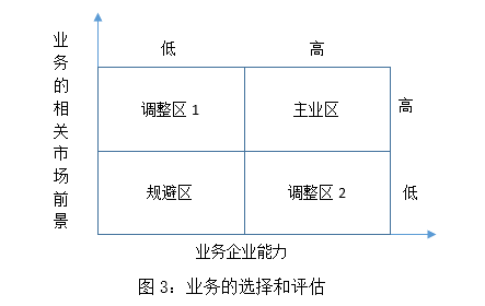 在調整區2中,城投公司在該業務上能力較強,但潛在的市場空間卻有限,公司也應當做出調整;如果集中資源能夠搶占競爭對手的市場,則應積極進入該業務領域,否則看這種能力是否能夠轉移,如果不能轉移,在盈利的情況下繼續經營。