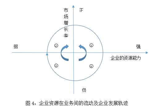 業務開始都是企業資源能力較弱,市場增長率很強,企業會注入資源;然后業務的企業能力變強,市場增長率會很高,企業繼續投入資源。但過了高增長期之后,該業務的增長率會降低,降低的原因是由于市場競爭者增多導致的。如果企業處于比較劣勢的地位,那么業務就會處于負增長,企業就應從中抽取資源投入有潛力或增長趨勢正強勁的業務。該業務的企業能力隨著資源的逐漸減少,業務能力弱化,企業進入第三象限,直至該業務消亡。