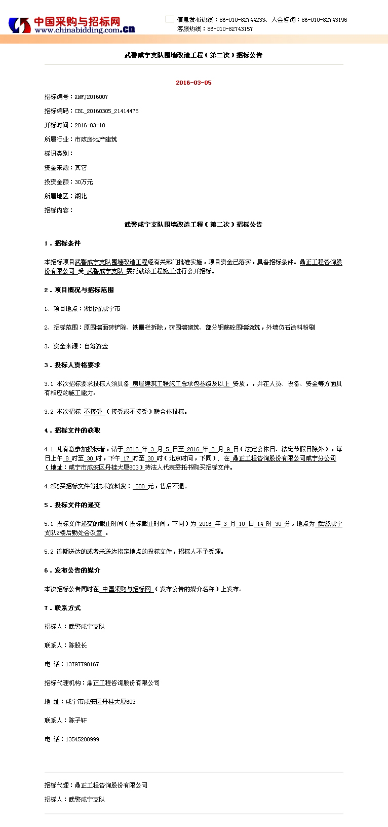 武警咸寧支隊圍墻改造工程(第二次)招標公告
