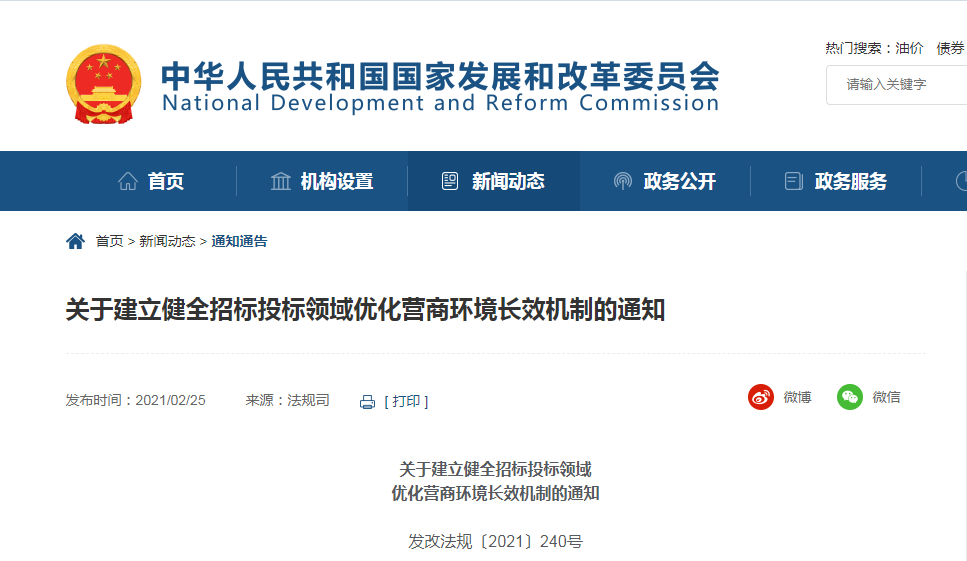 國家發展改革委:關于建立健全招標投標領域 優化營商環境長效機制的通知