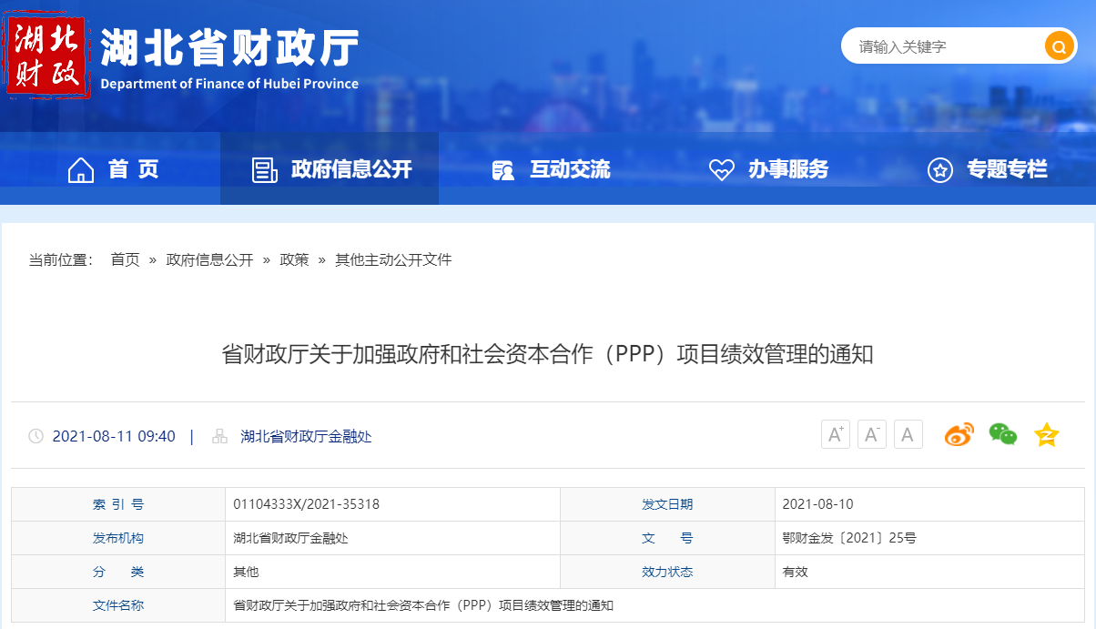 政策快遞 | 湖北省財政廳:“花錢必問效,無效必問責”,規范PPP項目績效管理工作