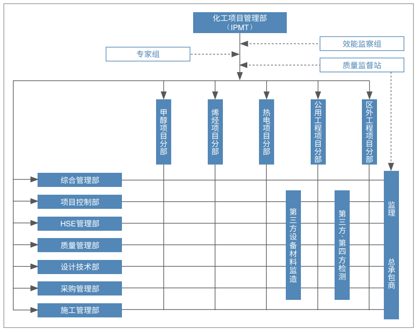 PMC模式是國(guó)際通行的現(xiàn)代工程建設(shè)項(xiàng)目管理模式,旨在規(guī)范、提升業(yè)主(建設(shè)單位)方的專業(yè)化工程項(xiàng)目管理水平。PMC模式是業(yè)主聘用專業(yè)化項(xiàng)目管理公司作為項(xiàng)目管理承包商代表業(yè)主或協(xié)助業(yè)主組織開(kāi)展項(xiàng)目的工程建設(shè)活動(dòng),實(shí)施專業(yè)化、科學(xué)化的項(xiàng)目管理,以有效實(shí)現(xiàn)工程項(xiàng)目的各項(xiàng)建設(shè)目標(biāo)。業(yè)主則以項(xiàng)目投資主體的身份,從建設(shè)目標(biāo)、資金籌措、政府協(xié)調(diào)等整體上監(jiān)督和控制整個(gè)項(xiàng)目,而不具體管理業(yè)主本身并非專長(zhǎng)的一些項(xiàng)目管理內(nèi)容。必要時(shí),業(yè)主委托監(jiān)理機(jī)構(gòu)在PMC管理下對(duì)工程現(xiàn)場(chǎng)施工進(jìn)行監(jiān)理。IPMT(Integrated Project Management Team)是PMC的演變形式,中文意為“聯(lián)合項(xiàng)目管理組”,又稱“一體化項(xiàng)目管理團(tuán)隊(duì)”,是指項(xiàng)目管理公司派出一批項(xiàng)目管理專業(yè)人員與業(yè)主的工程建設(shè)管理人員組成一體化項(xiàng)目管理團(tuán)隊(duì)(IPMT),IPMT代表業(yè)主對(duì)項(xiàng)目建設(shè)全過(guò)程實(shí)施管理(圖1)。▲圖1 PMC/IPMT模式運(yùn)行結(jié)構(gòu)圖