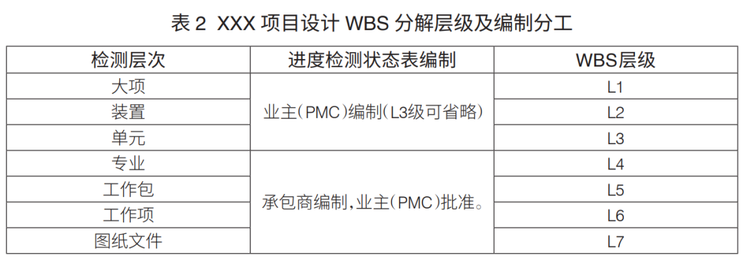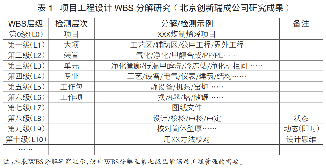 工程項(xiàng)目WBS分解層級(jí):工程項(xiàng)目WBS分解主要是進(jìn)行設(shè)計(jì)、采購(gòu)、施工WBS分解。通常,設(shè)計(jì)WBS分解至七級(jí)、采購(gòu)WBS分解至六級(jí)、施工WBS分解至六級(jí),可滿足工程管理要求(表1)。