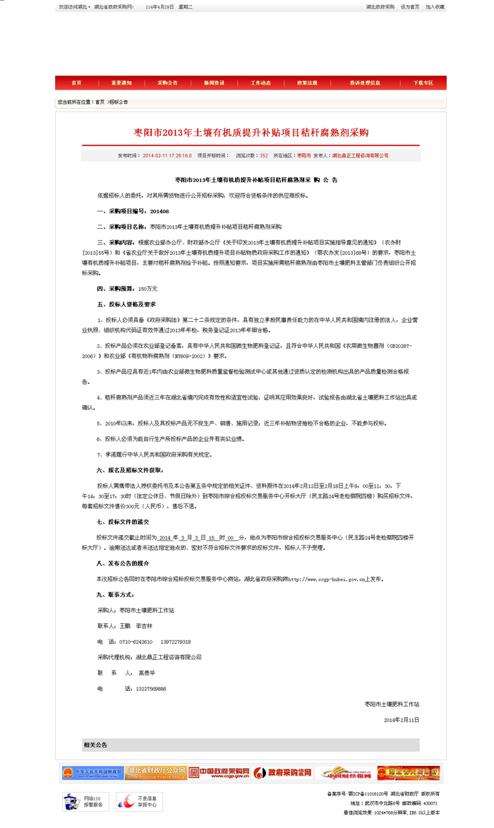 棗陽市2013年土壤有機質提升補貼項目秸稈腐熟劑采購