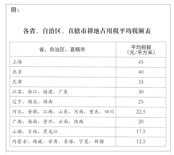 ▲各省、自治區、直轄市耕地占用稅平均稅額表