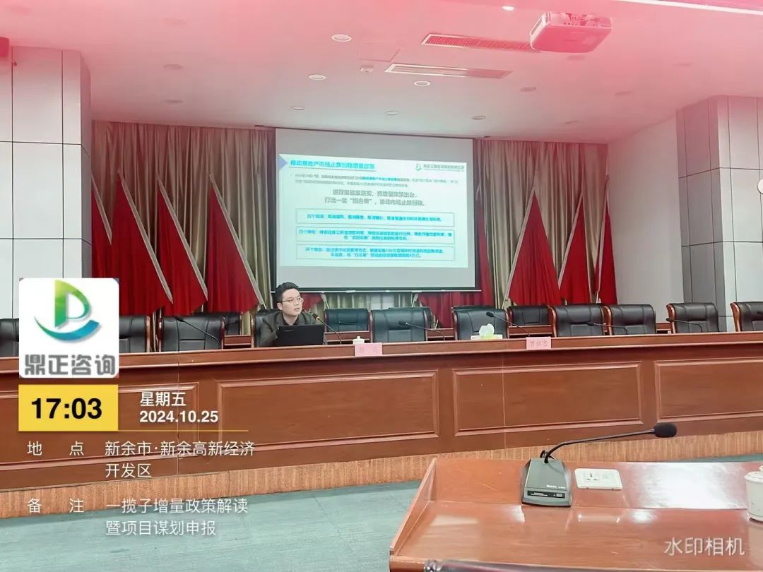 自9月下旬以來,國務(wù)院等多部門密集發(fā)布了一攬子增量政策,并引發(fā)了社會各界的廣泛關(guān)注。為搶抓增量政策窗口期,提升地方政府項目謀劃儲備質(zhì)量和項目謀劃水平,精準(zhǔn)擴(kuò)大有效投資。10月25日,鼎正副總經(jīng)理彭亮受邀為新余高新區(qū)政府作《一攬子增量政策解讀暨項目謀劃申報》的專題培訓(xùn)。