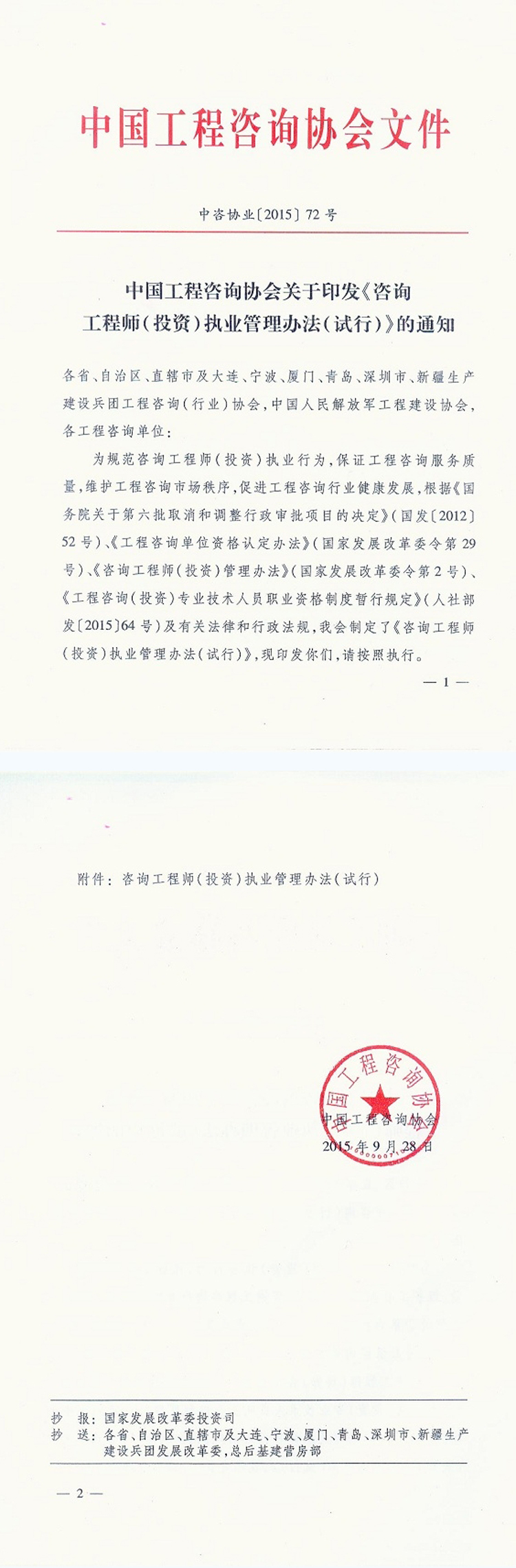 第四條 中國工程咨詢協(xié)會(以下簡稱“中咨協(xié)會”)是全國工程咨詢行業(yè)的自律組織,負(fù)責(zé)管理咨詢工程師(投資)及工程咨詢單位與咨詢工程師(投資)相關(guān)事項的執(zhí)業(yè)行為。