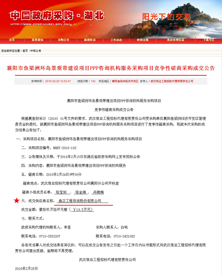 【經營成果】我司中標襄陽市魚梁洲環島景觀帶建設項目PPP咨詢機構服務采購項目
