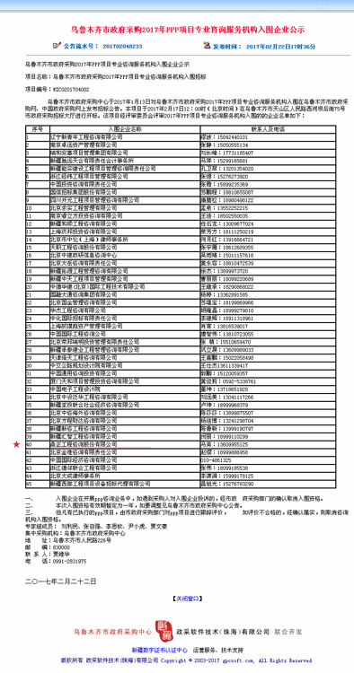 我司成功入圍烏魯木齊市政府采購2017年PPP項目專業咨詢服務機構庫,參與本次機構庫投標有300余家企業,我司成功脫穎而出,這是我司在新疆維吾爾族自治區入圍的第二個PPP機構庫,新疆市場開拓戰果累累,捷報連連,為我司繼續發展新疆維吾爾自治區市場打下堅實基礎。