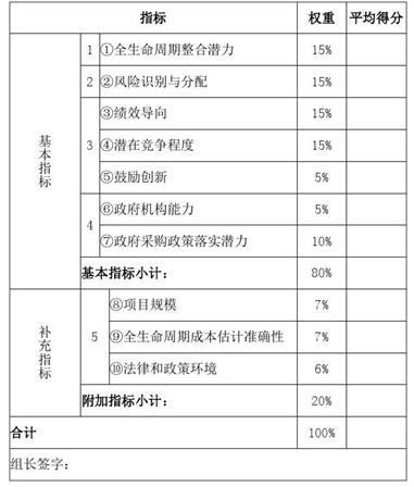 (二)評價方法。主要包括定性評價程序、指標及權重、評分標準、評分結果、專家組意見以及定量評價的PSC值、PPP值的測算依據、測算過程和結果等。