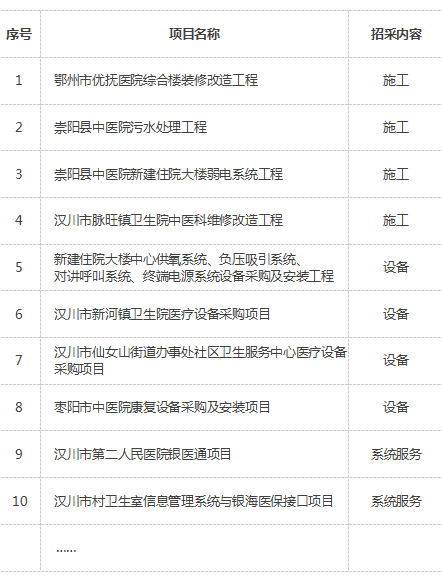 截止目前我司已為鄂州、咸寧、漢川、襄陽等地區的公立民營醫院及基層醫療衛生機構提供了30多個項目的招采服務。
