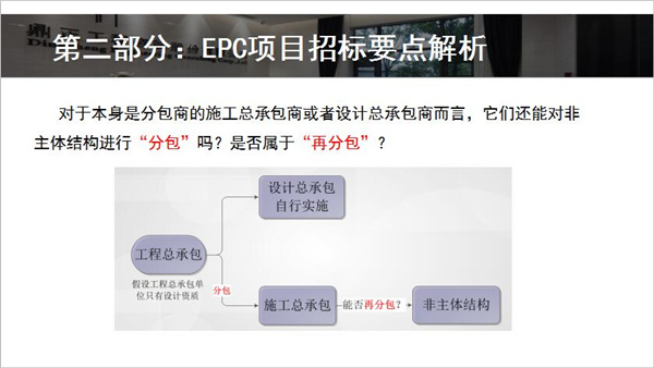 下午,采購與招標代理事業部的潘勝強帶來了《EPC項目招標實務》的主題培訓。潘勝強首先介紹了EPC模式的背景,包含工程總承包的主要模式,EPC發展狀況,EPC項目適用范圍,招標流程等多方面內容。隨后對EPC項目招標要點進行了解析,結合相關政策文件對工程總承包發包階段和條件、資格條件的設置、EPC項目前期單位是否可以參與后期投標、合同計價方式、分包原則進行了詳細的解讀。