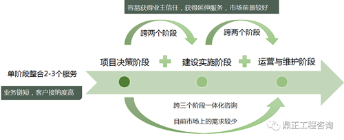 跨階段全過程程咨詢指提供跨兩個階段的服務,能實現項目管理+2項以上專業咨詢服務,容易獲得業主信任,獲得延伸服務,市場前景較好。