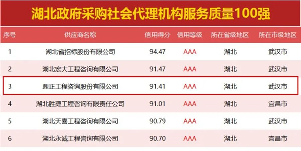 鼎正印記丨名列三甲 榮登湖北政府采購社會代理機構服務質量百強榜